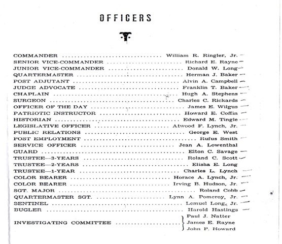 POST COMMANDERS MAY, 12, 1946 (estalished) 1946-47 WILLIAM R. RINGLER 1947-48 RICHARD E. RAYNE 1948-49 EDWARD M. TINGLE 1949-50 A. CARLTON MOORE 1950-51 ELWOOD B. RICKARDS 1951-52 WINFORD E. MURRAY SR 1952-53 JAMES E. WILGUS 1953-54 IRVING B. HUDSON JR 1954-55 ORLANDO T. COOPER 1955-56 LESTER B. TURNER 1956-57 WILLIAM P. SHORT 1957-58 IRVIN W. HUDSON 1958-59 WALTER G. MARVEL 1959-60 CARTER E. MINOR 1960-61 WALTER G. NEWTON 1961-62 WILLIAM P. SHORT 1962-63 IRVIN W. HUDSON 1963-64 CLIFTON E. HOLLAND JR 1964-65 WILLIAM P. MITCHELL 1965-66 ELMER B. STEELE SR 1966-67 FRANK K. RICKARDS 1967-68 ROBERT H. WILKINS 1968-69 ROGER A. THOMAS 1969-70 IRVIN W. HUDSON 1970-71 JOHN S. GLAZIK 1971-72 PAUL L. COOPER SR 1972-73 GEORGE (DANNY) STEELE 1973-74 EDWARD M. TINGLE 1974-75 EDWARD M. TINGLE 1975-76 HAROLD B.BARBER 1976-77 JOHN G. MITCHELL 1977-78 HARLEY V. TAYLOR 1978-79 PAUL L. COOPER SR 1979-80 JOSIAH NORTHUP 1980-81 WILLIAM D. THOMAS 1981-82 JOHN BRENNAN 1982-83 JOHN V. CURRY 1983-84 JOHN V. CURRY 1984-85 DONALD FELTENBERGER 1985-86 ROBERT MCCLAY 1986-87 PAUL W. BRENNAN 1987-88 WESLEY T. SAUBLE 1988-89 CHARLES R. HOOPER 1989-90 J. GEORGE STAIB 1990-91 J. GEORGE STAIB 1991-92 ROBERT E. BYLE 1992-93 GERALD N. FOURNIER 1993-94 LORETO P. TAGLIAFERRI 1994-95 GEORGE M. RITCHIE 1995-96 GEORGE M. RITCHIE 1996-97 GEORGE M. RITCHIE 1997-98 GEORGE M. RITCHIE 1998-99 LUDWIG KUBICKI 1999-00 GEORGE BLADES 2000-01 GEORGE BLADES 2001-02 WILLARD VENTRO 2002-03 LUDWIG KUBICKI 2003-04 RAYMOND DERRICKSON/ JAMES ATKINS 2004-05 HARRY HENKEL 2005-06 JOSEPH DOMANSKI 2006-07 JOSEPH DOMANSKI 2007-08 RICHARD BENNAR 2008-09 VERNON STEIN 2009-10 IRVIN HUDSON 2010-11 JOHN MITCHELL 2011-12 JOHN MITCHELL 2012-13 MIKE GRABOWSKI 2013-14 GEORGE “DANNY” STEELE 2014-15 FULTON LOPPATTO 2015-16 FULTON LOPPATTO 2016-17 JOHN HICKMAN 2017-18 DEAN LEVERING 2018-19 DEAN LEVERING 2019-20 DEAN LEVERING 2020-21 HAL DIETRICH 2021-22 HAL DIETRICH/JOHN GOSSART JR. |