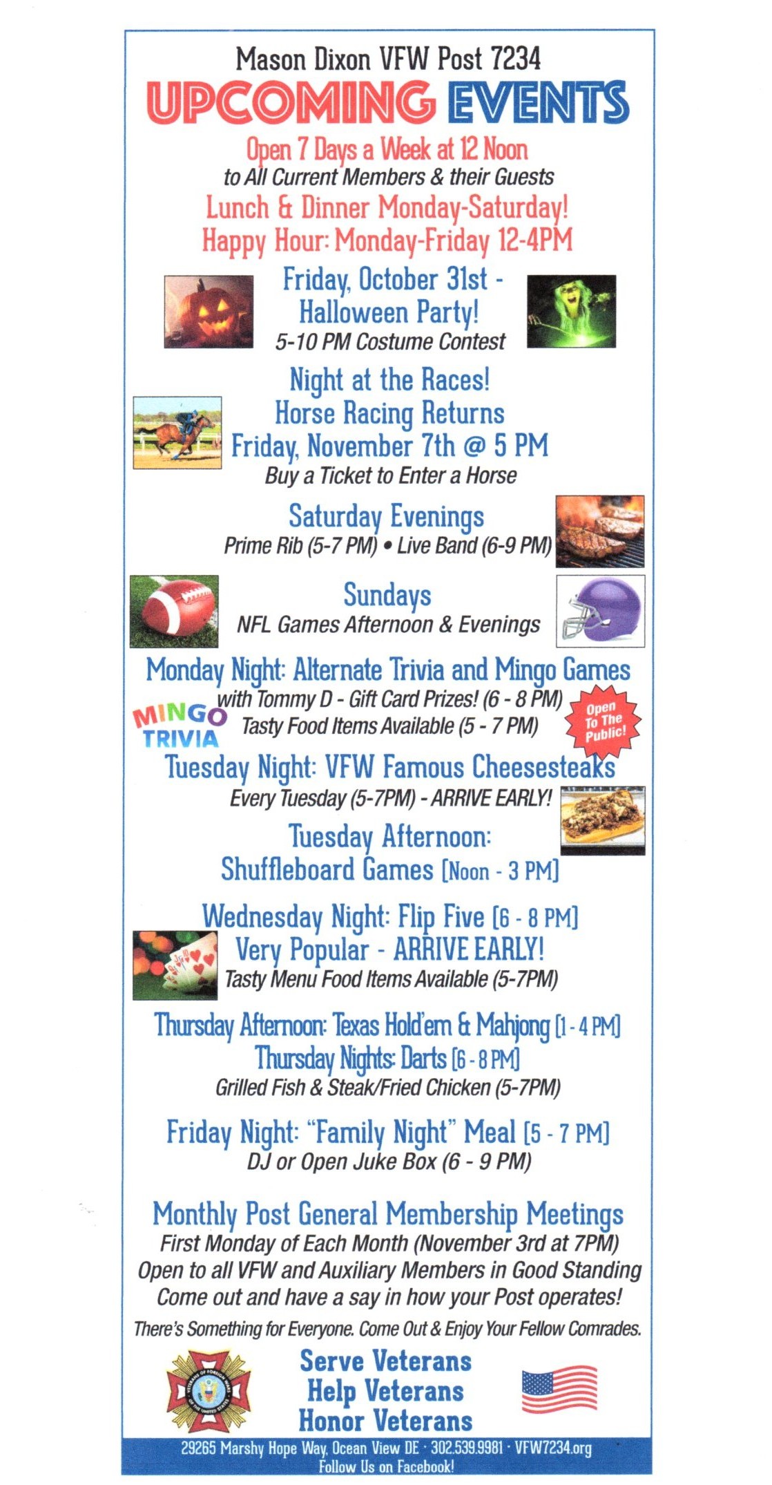 JOIN OUR VFW POST Fellow Comrade; I am Chad Myers, Commander of Mason - Dixon VFW Post 7234 in Ocean View, Delaware. Combat Veterans come join our Post to take advantage of everything our Post offers. Your Honorable Military Service has earned you the right to be a VFW Member. Our theme for the first year of my tenure as Post Commander is: SERVE VETERANS, HELP VETERANS and HONOR VETERANS. I believe that you can assist in this effort. We are offering two new incentives to help with the cost of Joining or Renewing your membership with our Post. First we still offer one year free annual membership for post 1900 eligible Veterans. Second incentive for Life Membership, for a limited time, if you join as a NEW member or if you are a current Annual member and want to switch to a Lifetime Member, the Post is prepared to offer you $100 toward that Life Membership cost. And that's not all. The Delaware VFW Department will match that $100. That is a grand total of $200 toward the cost of your Lifetime Membership application! That is a fantastic offer that I hope you will take advantage of. Depending on your age, it could represent a significant percentage of the cost. Also, your Membership wouldn't expire, so you will not have to remember to renew it each year. I invite you to visit the Post and complete a VFW Membership Application which is on the wall to the left as you enter through the front door. Alternatively, you can download the application from our Post website at vfw7234.com/join. Your supporting documentation will need to be attached to your Application, along with the proper lifetime Membership payment (minus the $200!). Once completed you may drop off your application at the Post, or mail it to: Post Quartermaster (Membership) Mason-Dixon VFW Post 7234 29265 Marshy Hope Way Ocean View, DE 19970 Thank you for your Service, and for considering our generous offer. - Chad Myers, Commander, VFW Post 7234